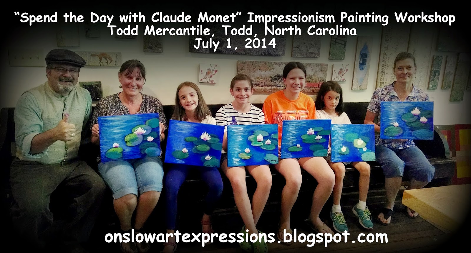 Onslow Art Expressions's Workshops at Todd Mercantile and Gallery in Todd, NC. Bernie had a great time teaching two painting workshops in the beautiful Blue Ridge Mountains this summer at the Todd Mercantile. On July 2, 2014... he Taught a Blue Ridge Painting Workshop to a SOLD OUT group of artists. On July 1st... Bernie dressed as Claude Monet as he taught the artists about Claude Monet and Impressionism. Like Monet... they turned out some beautiful Waterlily masterpieces. Thank you to all those who attended... it was great to make new friends. A special thanks to Helen Barnes-Rielly for organizing these special events for the folks in Todd. Check out all the photos HERE...